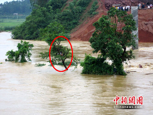 中新网南宁6月3日电 (王刚 韦龙贵)暴雨袭击广西,广西玉林一名男子带着小狗不断往高处逃跑,最后爬树避水求生,不断上涨的水位把他逼到了树顶端。所幸玉林消防官兵闻讯赶至,此时男子和狗已被围困了9个多小时。