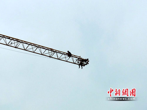 中新网柳州6月3日电(罗海生 黄坤军)6月3日,广西柳州市东环路一在建工地35米高的塔吊顶端,三名农民工为了讨薪欲跳塔。接警后柳州特勤消防大队迅速出动一台多功能救援车、1台53米云梯车,9名官兵赶赴现场救援,经过近一个小时的劝说三民男子才放弃了轻生的念头。