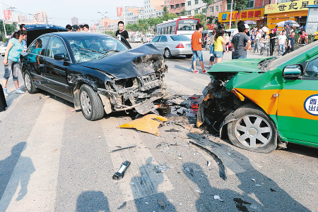 闻讯赶到的交警高新大队民警已在事发现场竖起了警示标志,距离血迹10多米远的马路中央,停着迎面相撞的一辆黑色帕萨特轿车和一辆出租车,两辆车前部都严重受损,帕萨特身后还停着一辆面包车,该车驾驶室一侧后轮被撞坏。车头严重变形的出租车身后则停着另一辆出租车,目击者说,由于避让不及,这辆出租车撞在了前面那辆出租车上。