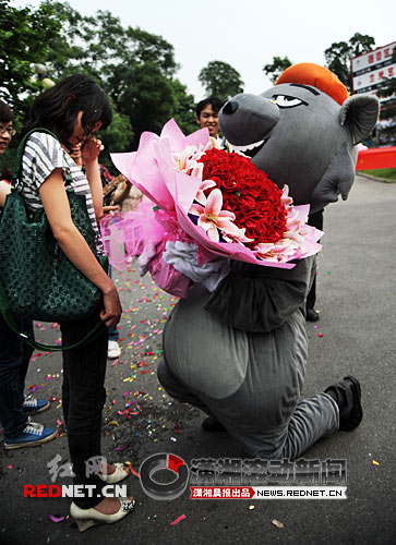 “嫁人要嫁灰太狼”,在网络流行的这一句话,6月4日在(湖南)株洲上演真实版。在乐队的伴奏中,吴先生手捧鲜花扮演灰太狼向女朋友求婚。
