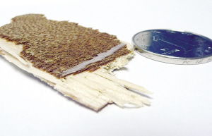 记者看到304室北面小屋的门,有一部分用牛皮纸贴上,轻轻撕开纸,赫然出现一个大洞。她说这是有天早晨喊女儿起床时敲通的。一个年过半百的女子,竟然敲门时就轻易地把门敲通,可见这门板的质量。果然,记者很轻易就掰下一块面板,这种复合木板的厚度不到3毫米,难怪经不起“敲”。
