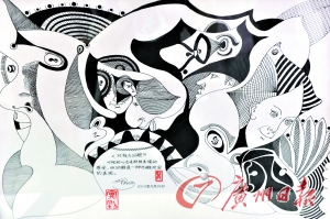 窗外,阳光明媚,绿草如茵,但阿刚很少抬头往外看。在广州市民政局精神病院职业治疗部的绘画室,49岁的阿刚有一张专属于自己的画桌。他常常纹丝不动地坐在桌前,低头凝视画纸,慢慢用钢笔在上面画画。他在画什么?大家不知道,但可以肯定的是,他绝对不是在随意乱画。大家认为那是抽象画,但阿刚自称是“理象派”。