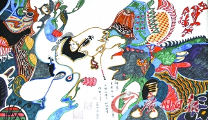 在一幅名为《喜悦》的作品里,阿刚画了一张似是而非的人脸。那是鼻子吗,怎么如此大而无当?那是眼睛吗,怎么一大一小一高一低?那是头发吗,怎么看起来像起伏的波涛?虽然看起来费解,但观众又分明感觉到一份笑意。阿刚在画作的题记中写了四句话:“生命之光,认知世界;丰收希望,感受喜悦。”