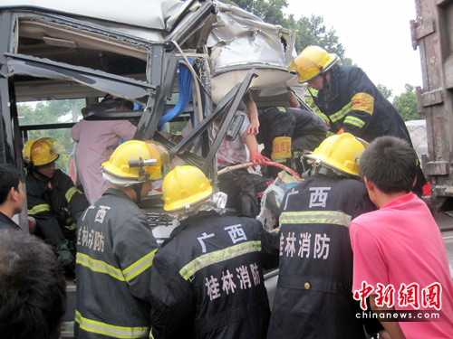 中新网桂林6月17日电 (付兴学 路宏用)16日中午,广西桂林市322国道兴安县永兴街路段,一辆长途客车与一辆拉煤大货车发生追尾事故,造成长途客车内7人受伤被困,其中客车司机伤势严重。接到报警后,兴安县消防大队官兵立即出动2辆消防车12名官兵前往事故现场救援。