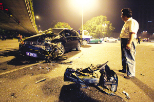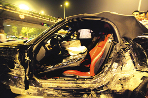 “乖乖,我跟在他后面说他要出事,这车开得像飞一样,果不其然才一分钟不到,真的出事了。”目击市民王长来先生说,事发时这辆宝马跑车从新街口方向,由东向西沿汉中路如飞一样开去。由于车速很快,加上深夜宝马跑车发出噪音,让马路上同方向车辆躲闪不及,其车子后面好像还有一辆超速跑车,王长来先生怀疑两车在超速飙车。“市区内贴地飞行能不出事吗?”王长来说,他跟到汉中门长途汽车站门口,宝马Z4敞篷跑车速度快得让他吃惊,突然在汉中门高架下,这辆宝马车与一辆本田商务车相撞,商务车左侧车头被撞得粉碎,宝马车则丢失了自己的左侧车门,腾空在原地打了一个180度转,原本车头向西被撞击后,车头一下子朝东了。