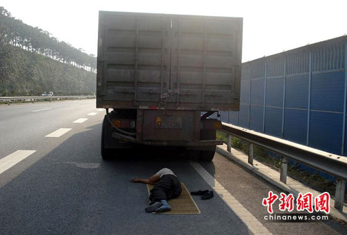 22日上午9时40分,在连霍高速公路634KM南半幅,记者看到了惊险一幕:一牌号为豫HD260挂的大货车停在应急车道上,司机侧卧于其货车后酣睡不醒,过往车辆纷纷绕行。交警了解后得知,刘某因为看世界杯太疲劳才拿高速路当床睡。(完)