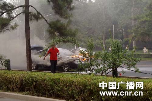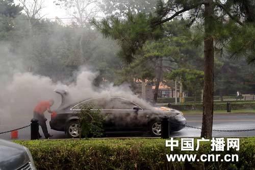 今天下午5点20分左右,一辆挂有北京牌照的奥迪小轿车在三里河主路上起火燃烧,记者初步断定为车辆自燃。在现场记者还看到发动机引擎盖内不断有火苗和浓烟冒出,交警正在维护交通秩序和向旁边的车辆借助灭火器。车辆大概燃烧了15分钟,随后消防车辆赶到彻底将余火扑面。截止记者发稿时,现场未出现人员伤亡。(记者李志勇)