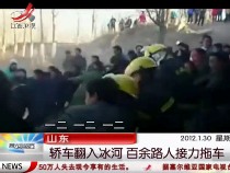 实拍:轿车坠入冰河 百余路人齐力拖车救人