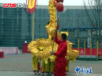【采访】面塑作者董昭武:在我们村,特别是每年丰收和各方面经济比较富裕的情况下,我们都参加制作龙和其它各项迎接新年到来这些活动。这个龙制作是飞龙形状,制作这个龙总共用了100多公斤白面,用人力每天80到100人,总共制作长达半个月。