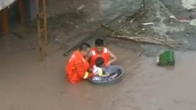 山洪围困民房 消防用脸盆急救小孩