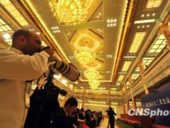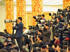 - 中新网报道:2010-3-14 09:46记者会即将开始,摄影记者已经将记者席“包围”,形形色色的大小摄像摄影器材已经架上,会场一派忙碌景象。