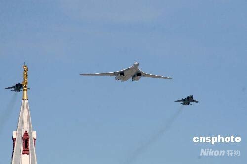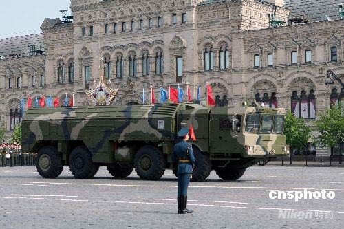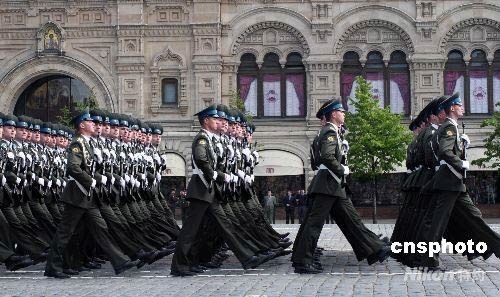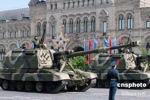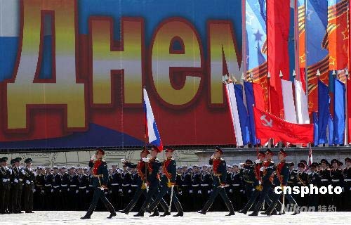 当地时间5月9日上午,俄罗斯为纪念卫国战争胜利63周年,在莫斯科红场举行盛大阅兵式。约8000名官兵、111辆现代履带式和轮式战车以及32架飞机和直升机参加这次阅兵式。 中新社发 田冰 摄