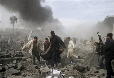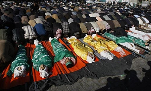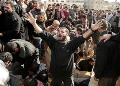 第六日 哈马斯领导人尼扎尔•拉扬的住所遭到以军轰炸,他本人及多名家人丧生。这是以军空袭加沙以来首次炸死哈马斯高级领导人。总死亡人数则上升至410人,2000多人受伤。当天,以色列国防部公布了“铸铅行动”的最新战报,称已摧毁了哈马斯位于加沙的450处据点,有25处是在新年第一天的袭击中击毁的。另外,联合国安理会召开会议,就呼吁加沙地带实现停火的决议草案进行讨论,但因英美反对而未获通过。【详细】