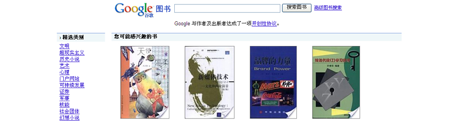 谷歌图书搜索战略合作部亚太区首席代表Erik Hartmann具体介绍了图书来源:“我们扫描的书籍有两个来源:第一个来源是我们的‘图书馆项目’,根据这个项目,我们扫描了由知名的40余家图书馆合作伙伴提供的藏书,其中包括密歇根大学图书馆和斯坦福大学图书馆。对于已经超过版权保护期的图书,用户可以免费阅读并下载整本图书。如果所扫描的图书仍在版权保护期内,我们最多只在搜索结果中呈现该书的三个片段;或应著作权人要求不呈现任何内容。” “第二个来源是我们的‘合作伙伴项目’,根据这个项目,合作伙伴(通常是出版社)授权我们对其图书进行数字化并在互联网上提供有限的内容预览。在进行‘内容预览’时,读者可以阅读图书的部分内容,一般为整本图书的20%。今天,有来自100多个国家的超过3万名著作权利人参与了这个项目,他们为我们提供了超过150万册图书的授权。仅在中国,就已有超过50家出版社向我们提供了6万本图书的授权。”[详细] |
