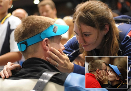失落的埃蒙斯走到妻子的面前,这位射落本届奥运会首金的捷克女神枪手,捧起丈夫的脸,轻轻地摩挲,用深情的注视和呢喃来安慰他……