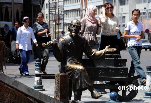 图:乌鲁木齐市民在大巴扎喂食广场鸽