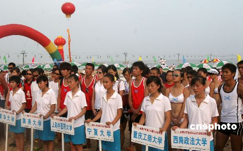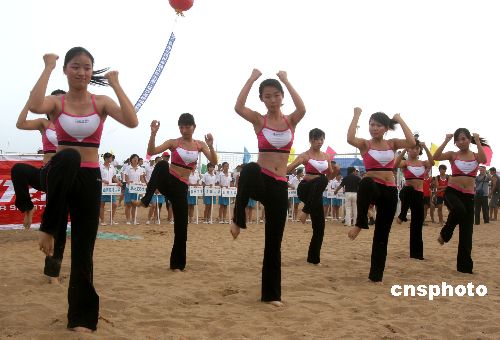 7月10日下午,上海中医药大学运动员在比赛中。当天中国大学生第二届沙滩排球锦标赛在河北秦皇岛市的南戴河海边开幕。据了解,此沙滩排球锦标赛由中国大学生体育协会主办,河北秦皇岛南戴河外国语职业学院承办,比赛采用“二人制沙滩排球”。来自清华大学、宁夏大学等全国22所高校43支男女沙滩排球代表队的200多名运动员、教练员将在3天时间展开169场激烈较量。中新社发 刘学忠 摄