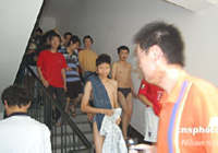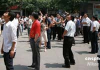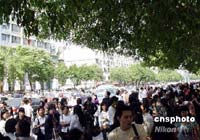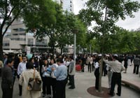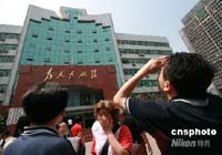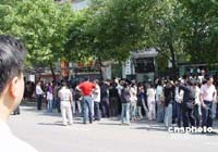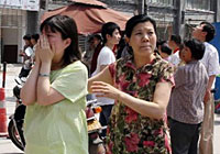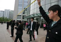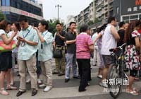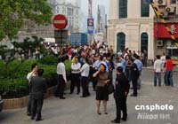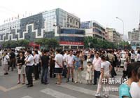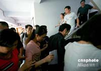 河南省会郑州受到四川地震波及,该市豫博大厦楼内跑出的民众。