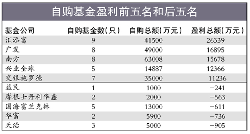 据统计,截至8月17日,40家自购盈利的基金公司中,盈利最多的前10家依次是汇添富、广发、南方、兴业全球、交银施罗德、华夏、工银瑞信、易方达、嘉实、长盛,其中盈利超过2亿元的公司只有汇添富,累计盈利2.6亿元;超过1亿元的有4家,分别是广发、南方、兴业全球和交银施罗德。