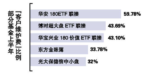 具体来看,18家已公布半年报的基金管理公司,上半年平均向渠道支出了13.76%的管理费用于“客户维护”。其中,支出“客户维护费”占其管理费收入最高的三家公司,分别为长信基金、东方基金、光大保德信基金,三家公司各自支出了自身管理费的23.61%、22.25%、20.98%用于“客户维护”。而从单个基金出发,这个数据则更为惊人。整体来说,业内最高三至五成的费用支出比例仍然让人咋舌。