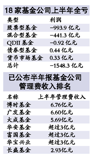 已披露的半年报显示,上半年,18家基金公司的旗下基金整体无一净赚。天相统计数据显示,上述基金公司纳入统计的234只基金上半年利润总计为-1548.3亿元(详见右表)。