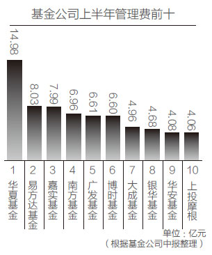 华夏、易方达、嘉实、南方、博时、广发、大成、华安、银华、上投摩根的管理费收入位于前10,合计高达70.51亿元,已接近全行业的一半。华夏以14.6亿元的管理费收入遥遥领先,易方达、嘉实、南方、博时的管理费收入分别为8.03亿元、7.99亿元、7.35亿元、6.76亿元。
