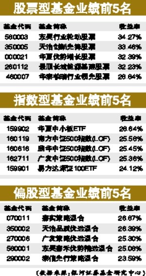 统计数据显示,三季度,全体偏股型基金(剔除次新基金)均赢得满堂彩,偏股型基金中的近400只成员全都实现正收益。银河证券统计数据显示,股基中东吴行业轮动、天治创新先锋、华夏优势增长和景顺长城能源基建这四只基金三季度收益率分别为34.27%、33.46%、32.39%和32.23%,成为股票型基金中的佼佼者。