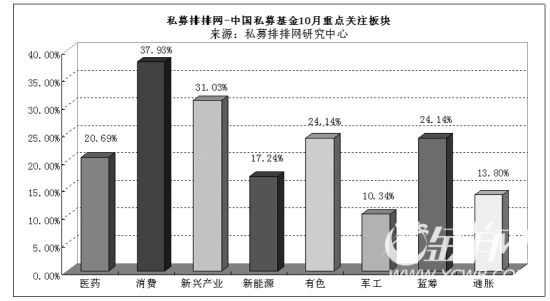 那么,10月份哪些板块最为私募所看好呢?调查显示,身负结构调整重任、代表着未来经济产业方向的消费和新兴产业仍是私募基金最为关注的板块,但对医药板块,私募的关注热情却有明显下降。