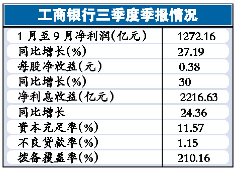 昨日全球市值最大银行工商银行(601398)公布三季报称,该行今年前三季度基本每股收益为0.38元,加权净资产收益率为17.77%。其中第三季度,工行实现净利426.13亿元,平均日赚4.63亿元。净利息收入2216.63亿元,同比增长24.36%。
