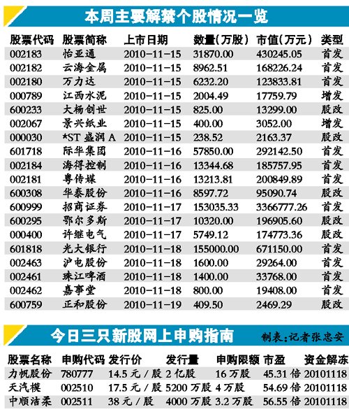具体来看,本周将有万力达、云海金属、粤传媒、怡亚通以及华泰股份五只个股在其限售股解禁后将实现全流通,其流通股本将面临较大的扩容。分析师表示,由于本周解禁的多数股票价格高于发行价,减持套现压力较大。
