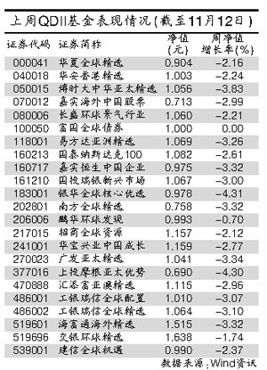 上周 (11月8日~11月12日),不仅A股市场遭遇深幅调整,美股以及港股也均出现下跌。受累于海外市场的下跌,QDII基金自然难保净值不受损失,数据显示,上周仅1只债券型基金净值不变,其余基金净值全都下跌。