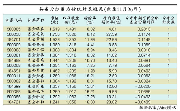 业内人士介绍,封闭式基金的分红需要同时满足两个条件:一是基金的单位净值在1元以上;二是基金“可供分配收益”为正,需要“先弥补上年度亏损”。也就是说,只要是目前具备有可供分配的收益,而且目前的净值在1元以上的封基都有分红潜质。