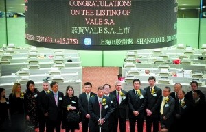 全球最大铁矿石生产商淡水河谷昨日正式在香港以预托证券(HDR)的方式上市,开盘报价270.4港元,收于265.2港元,成交金额5004万元。淡水河谷首席财务官卡瓦尔坎迪表示,希望通过这次在港发行,将投资者的基础扩大至亚洲。据介绍,淡水河谷希望能够登陆沪市,不过暂无具体计划。图为淡水河谷公司首席财务官吉列尔米·卡瓦尔坎蒂(前中)和嘉宾在上市仪式上。(张奕)
