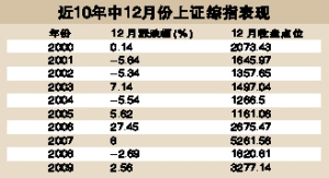 统计数据显示,2000年到2009年的10年间,沪指在12月上涨的有5年,下跌的4年,平盘的1年。上涨的分别是2003年、2005年、2006年、2007年和2009年,其中2006年12月份涨幅最大,达到27.45%,最小的2009年也有2.56%。而下跌年有2001年、2002年、2004年、2008年。其中下跌幅度最大的年份为2001年,跌幅达5.84%,下跌幅度最小的是2008年,跌幅为2.69%。另外,2000年12月份沪指涨跌持平,仅微涨0.14%。