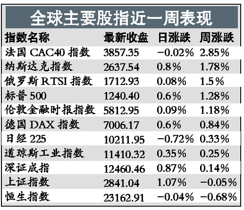 虽然中国A股近期萎靡不振,但其他多数股指表现抢眼,其中,受利好数据提振,美国道琼斯指数上周五报收11410.32点,上涨0.35%,且已经实现连续两周走高。其中,纳斯达克收盘创下2007年12月以来的新高。而法国股市更是以2.85%的单周涨幅领涨全球股市。