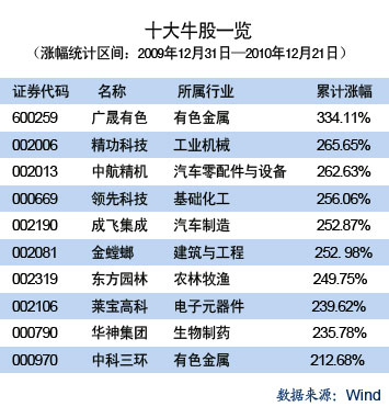 中新网12月22日电(王安宁)虎年行情即将收官,虽然并未如年初投资者所期待的“虎虎生威”,但个股行情却是精彩纷呈,牛股辈出,个个身怀绝技。截至12月21日收盘,两市涨幅超过200%的个股有16只。结合各媒体及数据,中新网证券频道整理出今年较有代表性的十大牛股,以期对投资者有所帮助。