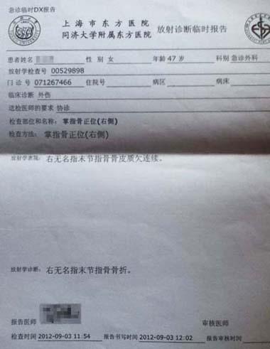 李女士向记者提供的医院诊断报告显示,她被确诊为右手无名指骨节末端开放性骨折。“开始他们没打算送我去医院,在我强烈要求下才把我送到附近医院救治”。