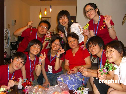 七月九日,应宋庆龄基金会邀请前来大陆参访的台湾大学生走进北京普通百姓家体验生活。图为北京大学生刘婉菁(后排中间)的母亲(前排右三)教台湾学生们用五彩透明珠穿制成的北京奥运会吉祥物福娃。中新社发 路梅 摄