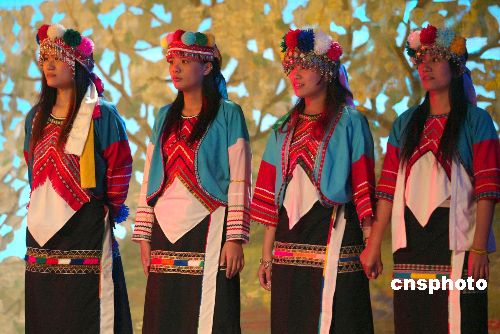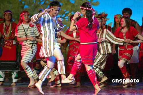 七月十日,来自台湾岛内、港澳、海外以及在大陆求学的一千三百多位台湾同学在北京开展“二○○六年台胞青年千人夏令营”活动。在开营仪式上台湾少数民族青年展示民族服饰表演歌舞,展示当地民族风情。此次夏令营以“龙脉相传,青春中华”为主题,是二○○四、二○○五年以来全国台联第三次举办两岸最大规模青年学生交流活动。中新社发 杜洋 摄