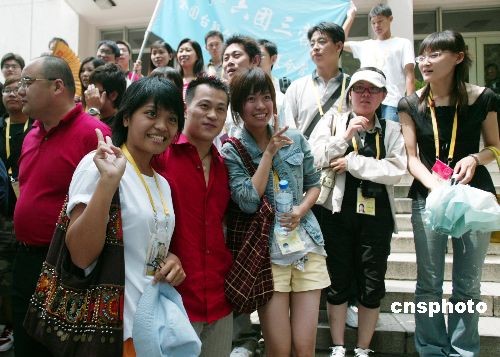 七月十二日,参加“二00六年台胞青年千人夏令营”的台湾青年参观北京体育大学,台湾青年与奥运举重冠军张国政合影留念。中新社发 杜洋 摄