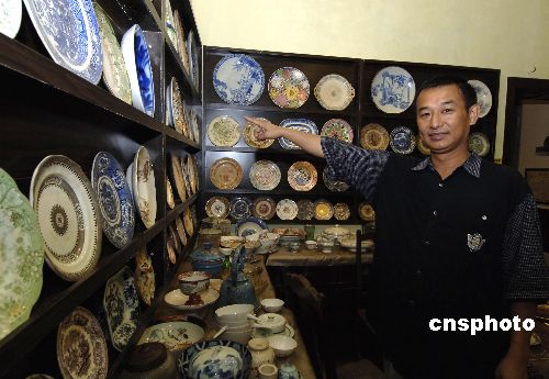 七月十七日,台湾商人洪明章在“怀旧鼓浪屿”纪念馆介绍其收藏的十九世纪初外国领事馆人员在鼓浪屿所使用过的瓷器。“怀旧鼓浪屿”纪念馆是洪明章先生花费七年心血,投入巨资创办而成,该馆生动展现了洋人的生活起居场景,外国领事馆的重要文件和珍贵文物达万件之多。中新社发 王东明 摄