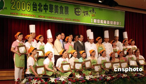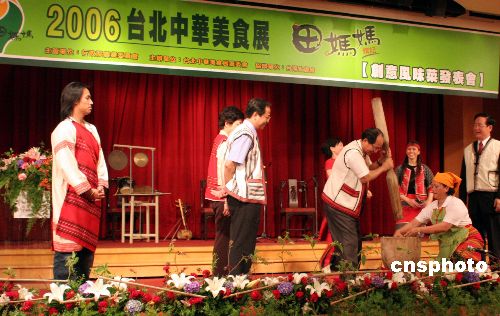 六月二十六日,二○○六台北中华美食展“田妈妈”创意风味菜举行发表会。会上表演的泰雅族丰年祭及婚宴时的“捣麻薯”舞蹈。中新社发 陈立宇 摄