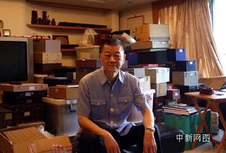 依约到台湾著名收藏家王度家里访问。一进门,记者一下子就“傻了眼”,只见近百平方米的客厅,除了一条通往内室的小道,一块十来平方米的地方摆着沙发茶几招待客人外,其余地方都放满了他收藏的物件,大至黃梨木古董家具,小至茶壶、扳指,上下相迭,应有尽有。
