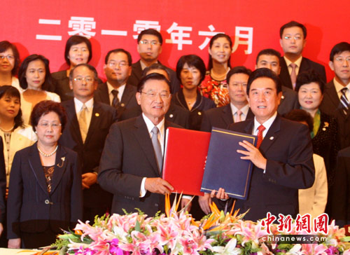 6月29日下午,海协会与海基会在重庆申基索菲特酒店举行仪式,正式签署两岸经济合作框架协议和两岸知识产权保护合作协议。图为海协会会长陈云林与海基会董事长江丙坤展示协议。