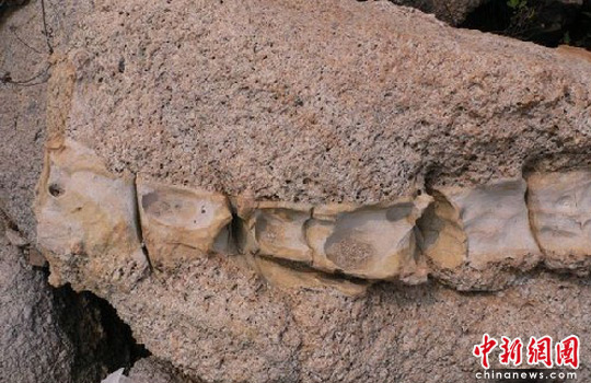 近日,粤东南澳岛一名陈姓渔民无意间发现了一块疑似巨型古脊椎动物的化石。从化石的保存情况看,该古脊椎动物在生前应是一个庞然大物。 有关方面表示,该化石出土点的发现,对研究周边地区古生物、古环境的演化提供了非常有价值的科学资料。中新社发 张进盛 摄