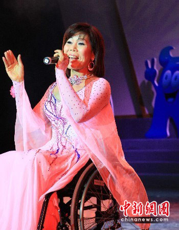 6月29日,上海举行“共享世博共享欢乐残疾人艺术交流”演出,台湾弦月舞集艺术团的肢残歌唱家任文倩演唱邓丽君组曲惟妙惟肖,赢得喝彩。中新社发 潘索菲 摄