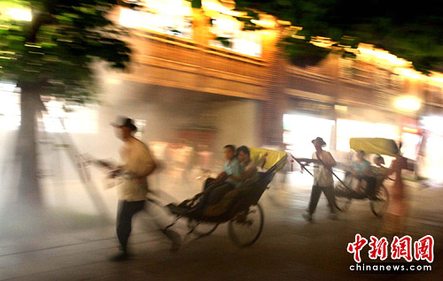 6月29日晚,经过久雨的福州气温骤升,逛福州市南后街的市民,惊喜发现整条街笼罩在云雾之中,不仅让人们感受到丝丝清凉。据了解,福州市古街水雾降温系统主要安装在南后街南北口风雨廊、蓝建枢故居外侧和南后街中段屋檐及大树上,基本覆盖了千米南后街,大约每米距离之间布一喷雾口,不定时喷出的水雾可降温6℃左右。目前这个系统还处于试用阶段。中新社发 杨婀娜 摄