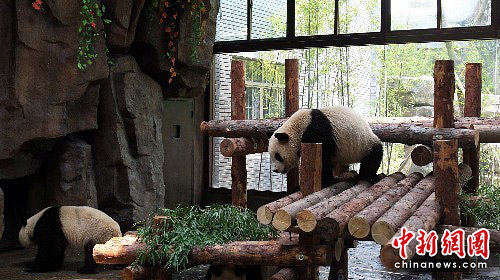 上海野生动物园新建的最具生态、豪华的“世博大熊猫馆”开馆迎客。中新社发 潘索菲 摄