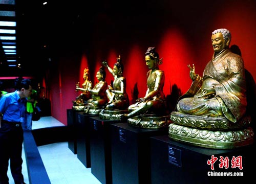 “圣地西藏---最接近天空的宝藏”特展,6月30日在台湾故宫博物院揭开面纱。这次展览是台湾历年来规格最高、面向最完整的西藏文化与文物展,展出的130组件文物,来自西藏布达拉宫、罗布林卡等寺庙、西藏博物馆、承德避暑山庄和北京民族文化宫等12处文物重镇。整个展览按“吐蕃王朝”、“金色宝藏”、“文化交流”、“雪域风情”四部分布局展出,展览9月19日结束。中新社记者 宋吉河摄