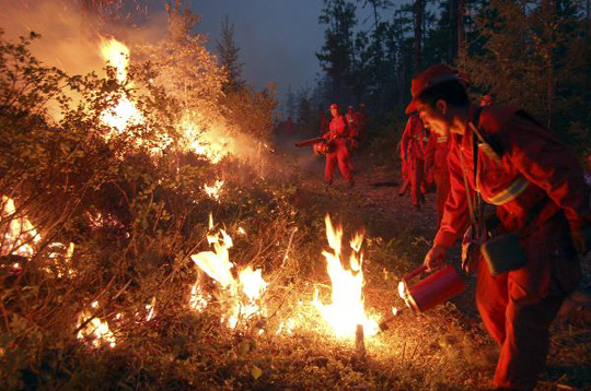6月28日,武警黑龙江省森林总队官兵在火场灭火。